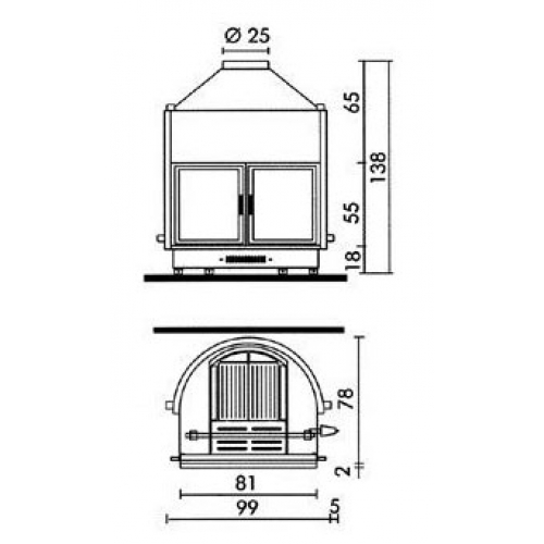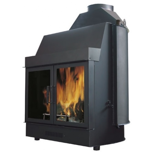 Дверца открывается вбок. Корпус из утолщенной стали, чугунный очаг, витрокерамическое стекло, резистентное к температуре до 800°, бак для воды на 90 литров.